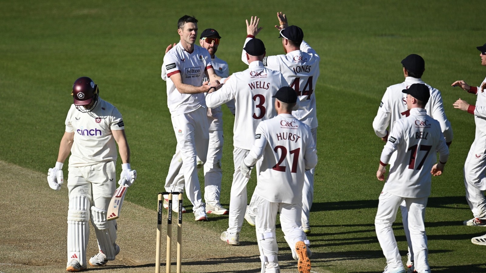It was a productive day for veteran seamers, with Ben Sanderson – six years Anderson’s junior – earlier mopping up the Lancashire tail to finish with five for 79.